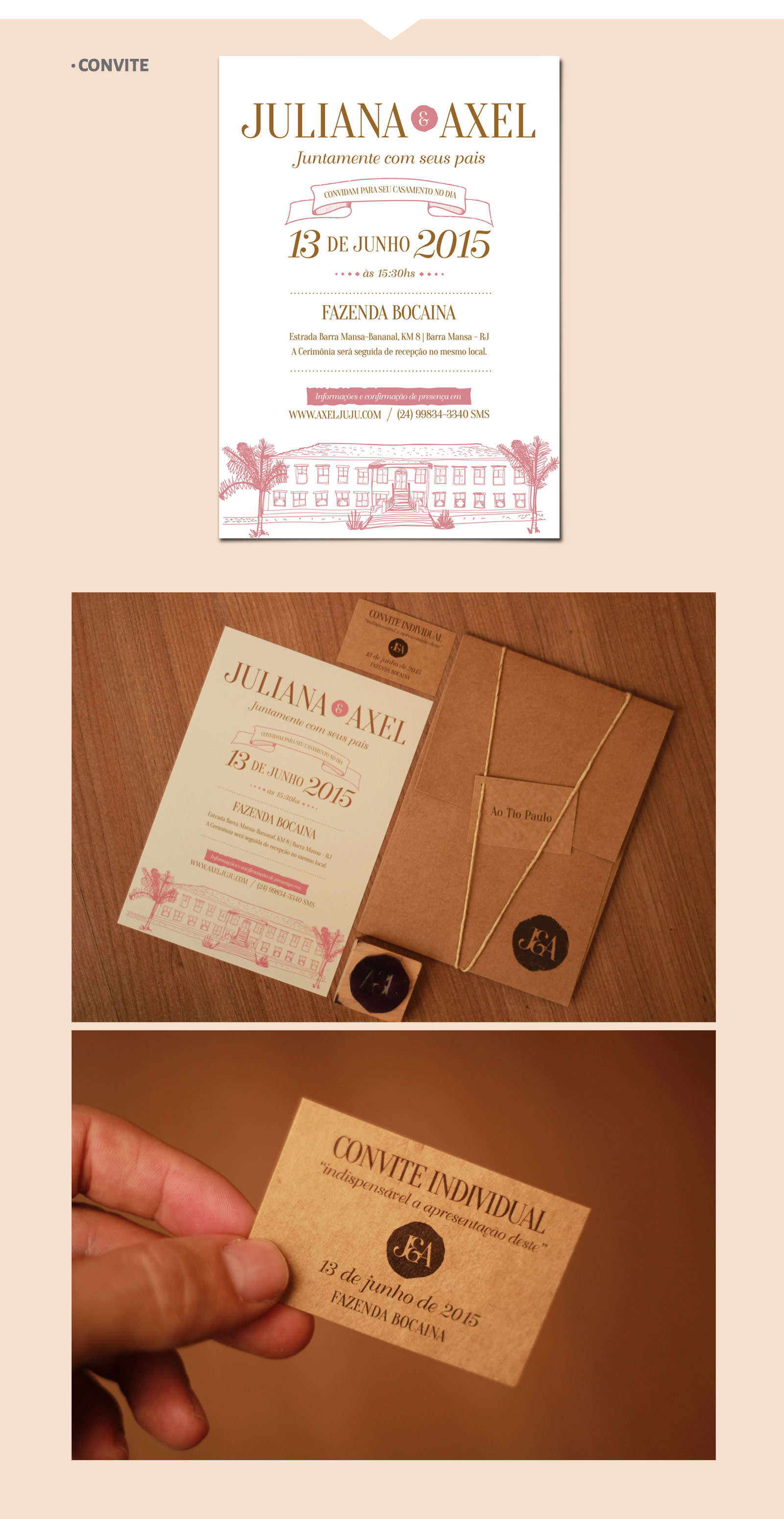 Casamentos no campo pedem um toque rústico e/ou natural. Neste caso a impressão foi digital convencional, mas a arte contendo ilustração manual, o papel feito com fibra de algodão, o cordão de sisal, o papel kraft utilizado no envelope, na tag e nos convites individuais e o carimbo deram conta do recado!